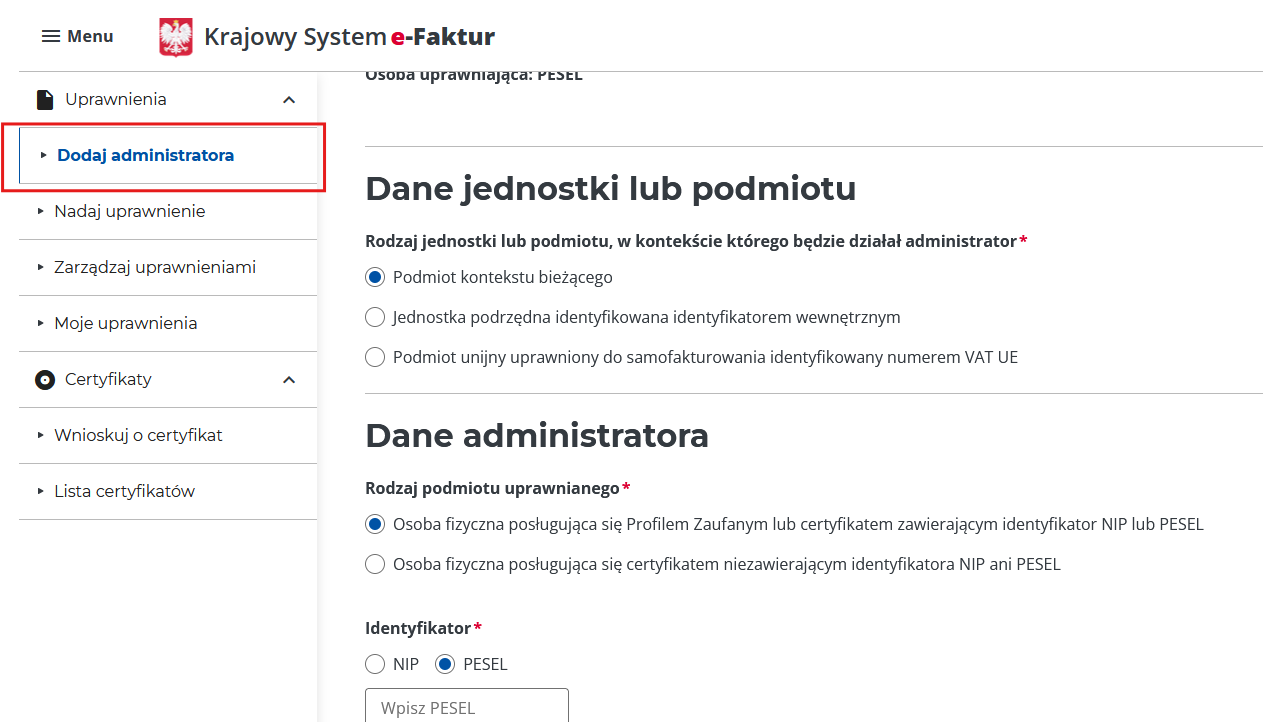 Po uzyskaniu dostępu do KSeF na podstawie ZAW-FA możemy dodać administratora, który będzie nadawał dalsze uprawnienia pracownikom i innym instytucjom.