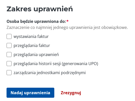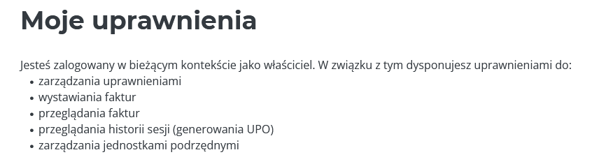 Administrator może nadawać uprawnienia do określonych czynności jak wysyłka faktur, ich przeglądanie czy weryfikacja przetworzeń dokumentów (UPO).